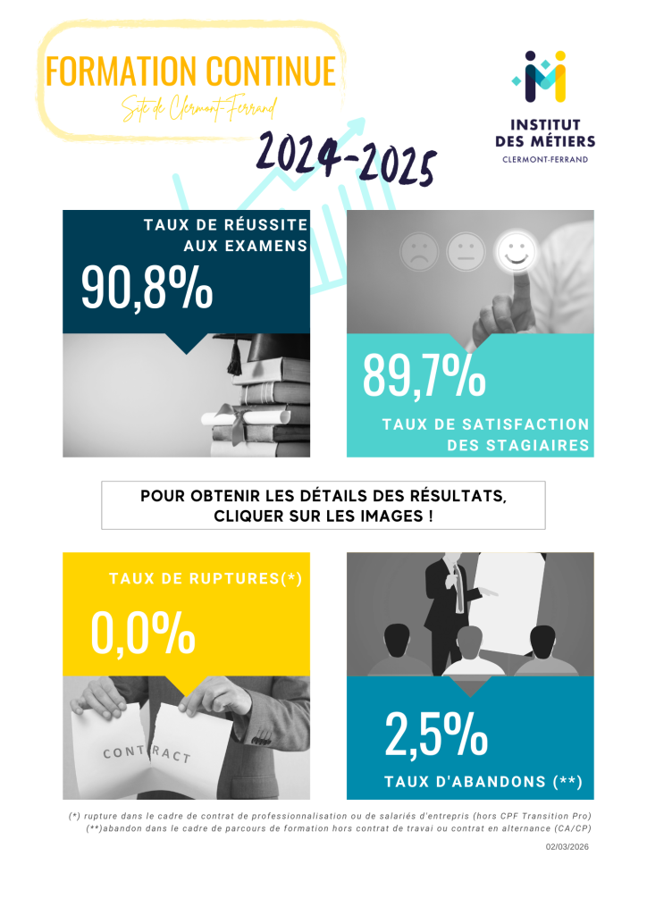 Dans notre quête continue d’excellence en formation continue, l’Institut des Métiers d’Ambert affiche des résultats pour l’année 2023-2024. Notre engagement envers la qualité de l’enseignement et la satisfaction des stagiaires reste notre priorité absolue.